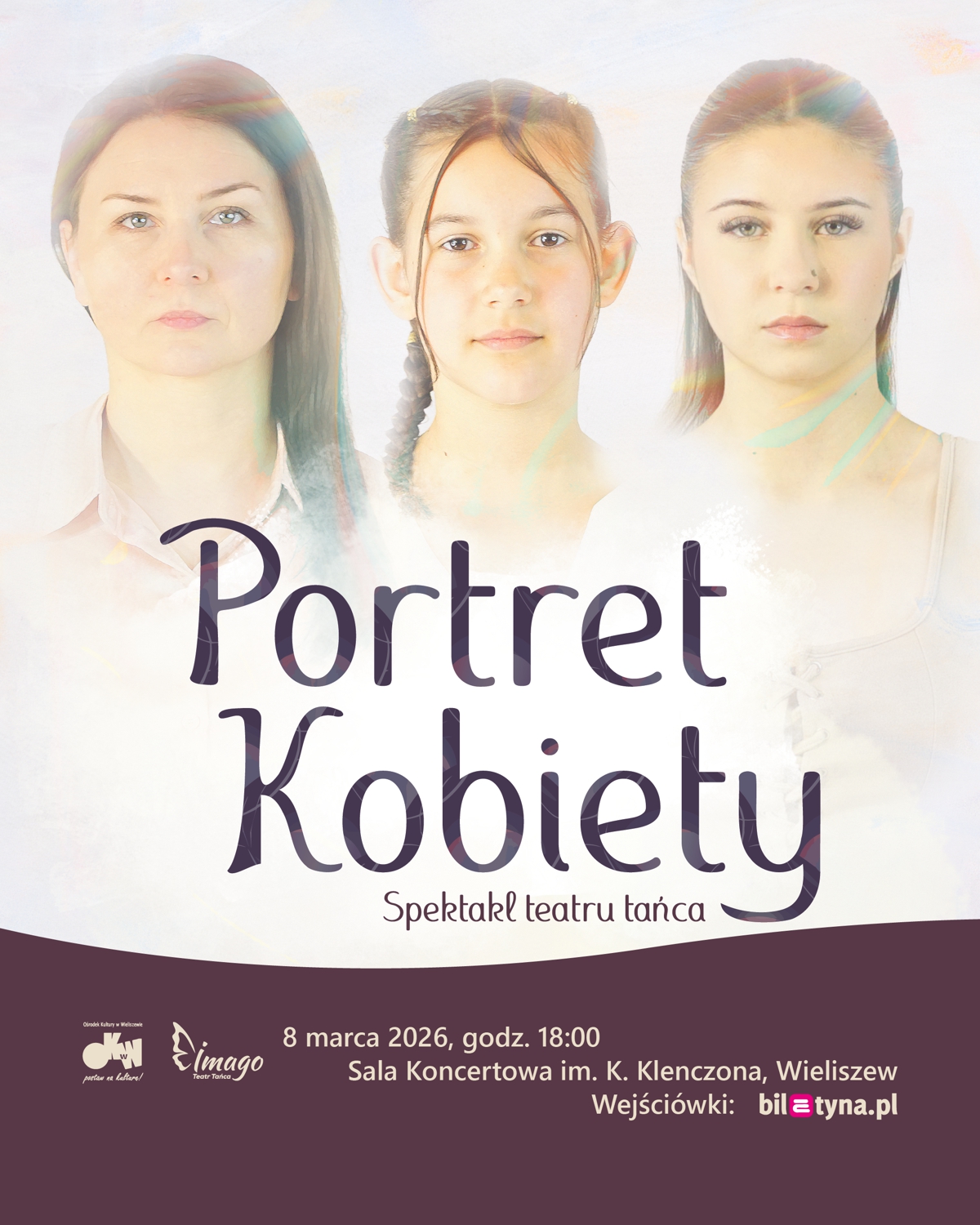 Zapraszamy na kolejne spotkanie z poruszającym spektaklem tanecznym w reżyserii i choreografii Kariny Warnel-Żakowskiej, którego premiera miała miejsce 8 czerwca 2025 r. "Portret Kobiety" to pełen emocji obraz kobiecego życia – od pierwszych marzeń po dojrzałą mądrość. Na scenie trzy taneczne pokolenia – tancerki sekcji tańca jazzowego, nowoczesnego oraz Teatru Tańca „Imago” działających w Ośrodku Kultury w Wieliszewie. Wyborna propozycja na Dzień Kobiet!