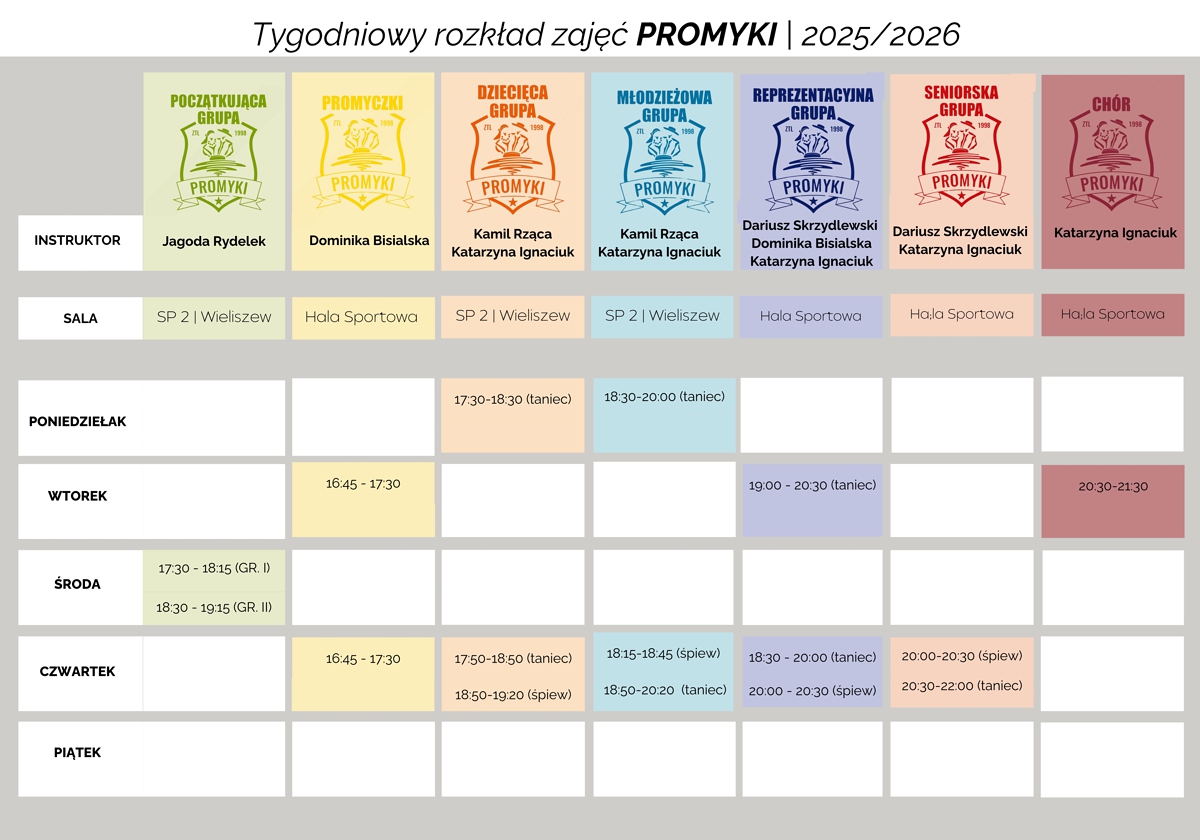 - grupa reprezentacyjna (instruktorzy Dominika Bisialska, Dariusz Skrzydlewski) – wtorki 19-20.30 (taniec) oraz czwartki 18.30-20 (taniec) i 20-20.30 (śpiew – instruktor Katarzyna Ignaciuk);